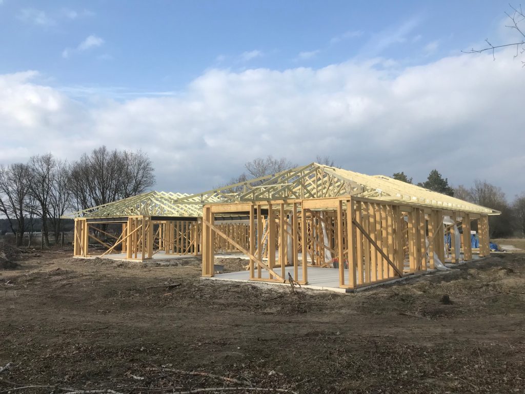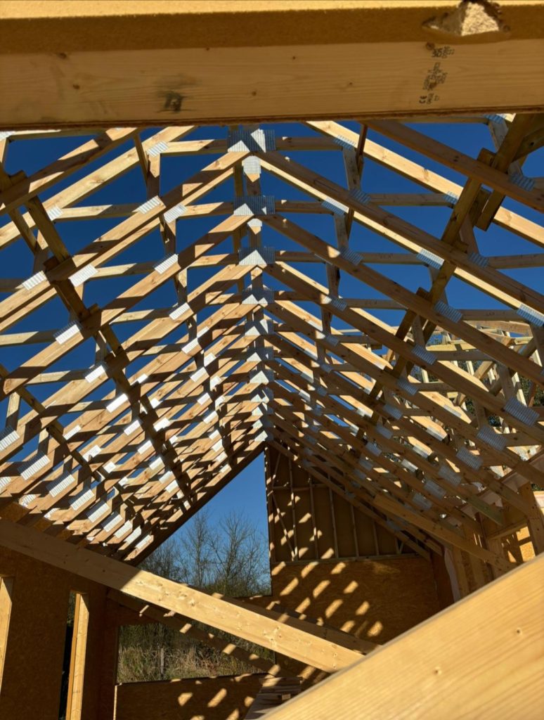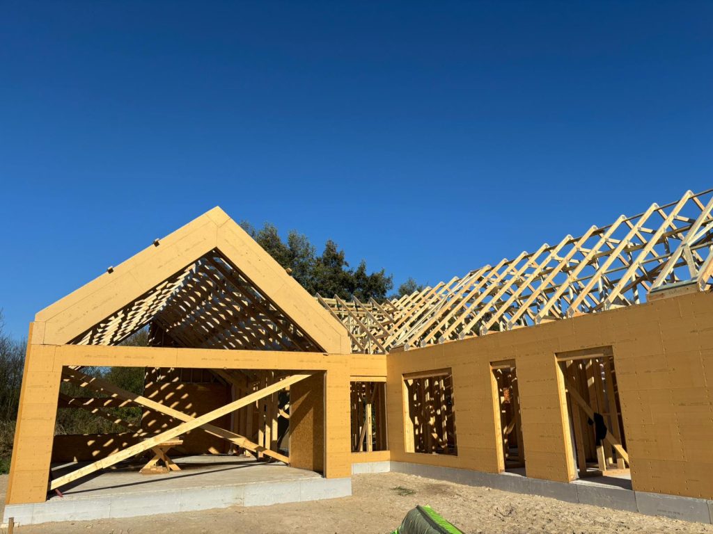 Zrównoważone budownictwo? Prefabrykowane wiązary to mniejsze zużycie drewna i zero marnotrawstwa. Do tego produkcja odbywa się pod dachem, niezależnie od pogody – bez mokrych desek i błota po kolana.